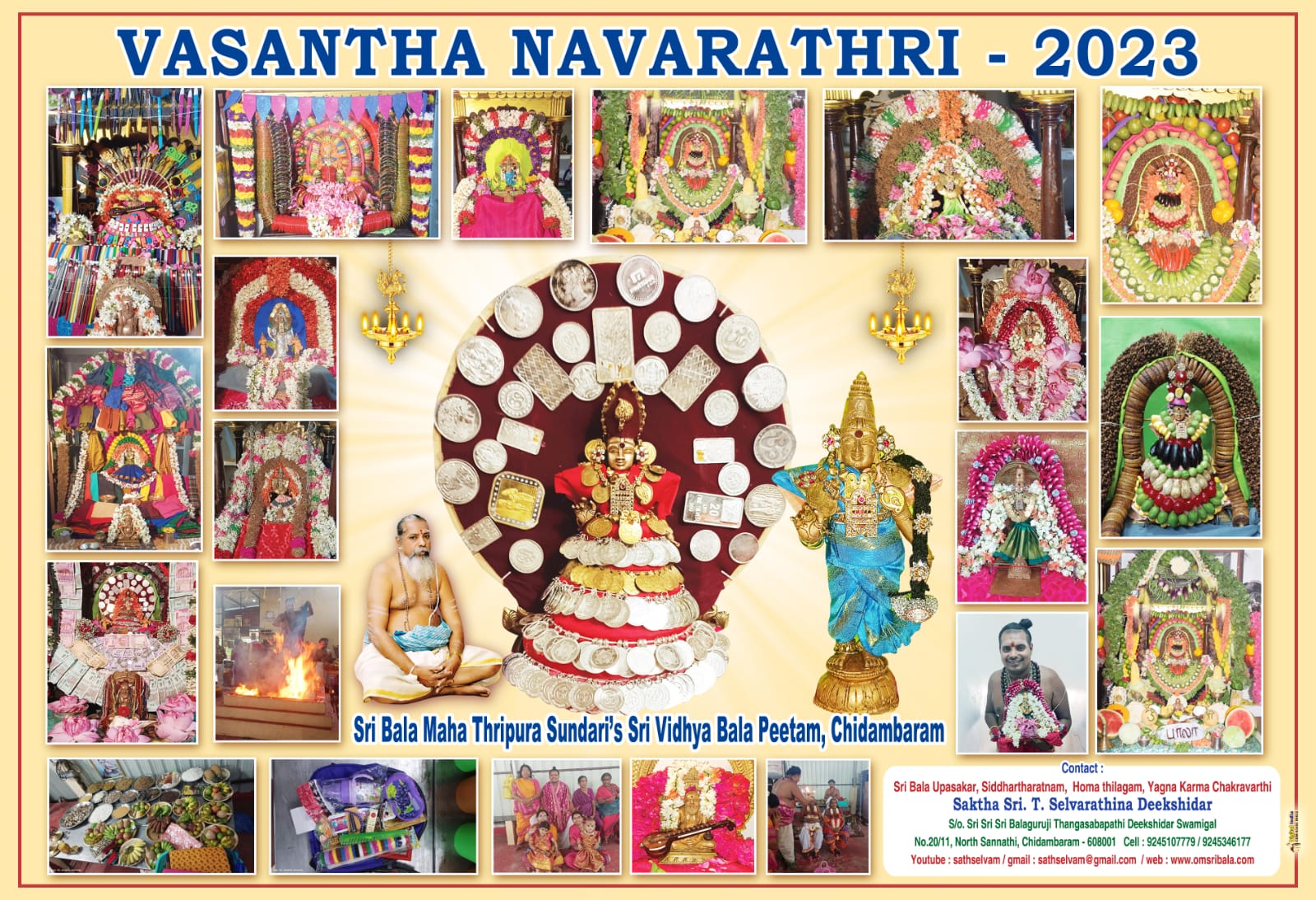 Doing ‘Sankalpam” By saying yours Name, Birth star, Rasi, Gothram.By This Yagam you can get rid of bad deeds, Sri Runavimachana Ganapathi Homam – To get rid of debts , Sri Swayamwara Kala Parvathi Yagam – To get obstacles in Marriage , Sri Santhana Gopala Krishna Yagam – To get Child Birth, With this Homam Sarva Mangala Maha Chandi Yagam is done which gives all types of Power. For 10 Days both Morning & Evening Food Donation, Vaduka Pooja, 108 Kanya Pooja , 108 Swasini Pooja & sarees given for 200 poor Womens. These are Done with the blessing of Sri Bala Donates a lot and Get Blessings of Sri Bala Maha Thripura Sundari.