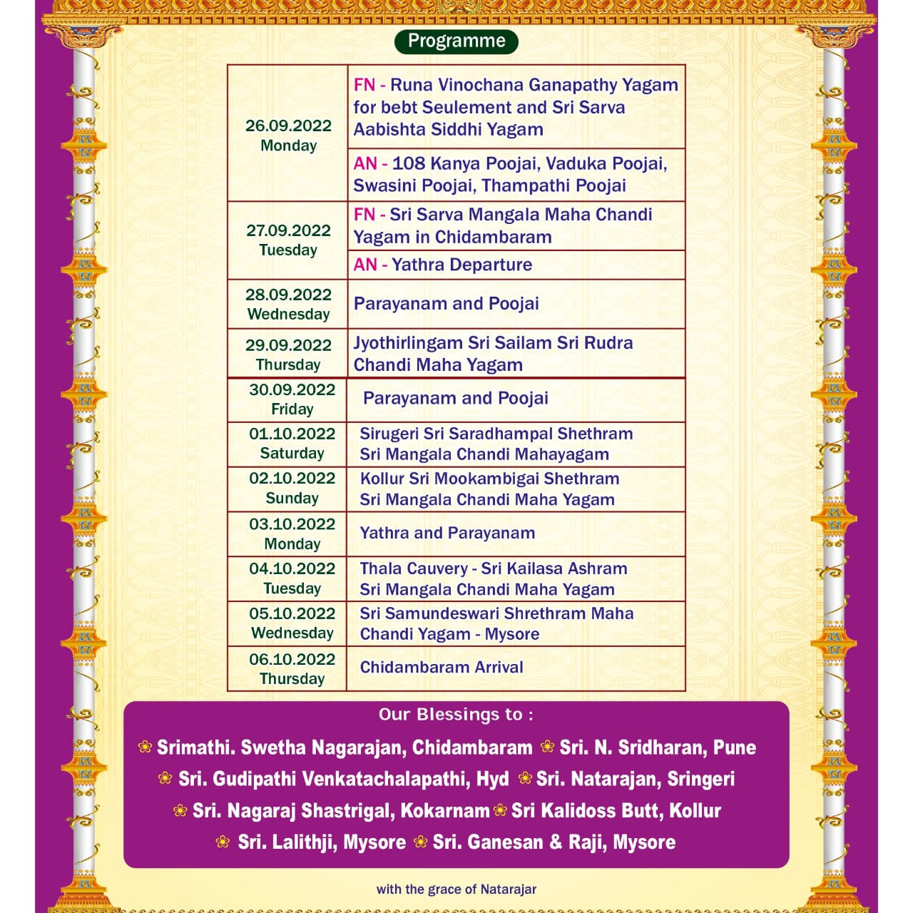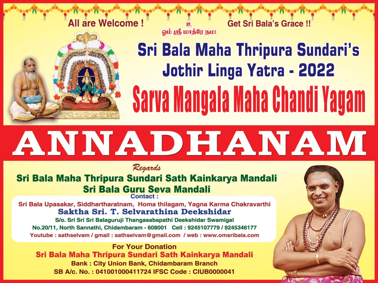 Doing ‘Sankalpam” By saying yours Name, Birth star, Rasi, Gothram.By This Yagam you can get rid of bad deeds, Sri Runavimachana Ganapathi Homam – To get rid of debts , Sri Swayamwara Kala Parvathi Yagam – To get obstacles in Marriage , Sri Santhana Gopala Krishna Yagam – To get Child Birth, With this Homam Sarva Mangala Maha Chandi Yagam is done which gives all types of Power. For 10 Days both Morning & Evening Food Donation, Vaduka Pooja, 108 Kanya Pooja , 108 Swasini Pooja & sarees given for 200 poor Womens. These are Done with the blessing of Sri Bala Donates a lot and Get Blessings of Sri Bala Maha Thripura Sundari.